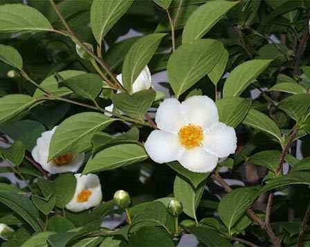 ナツツバキは「シャラノキ」とも呼ばれます。葉・花ともに小さく清楚で、樹形が整いやすく庭木によく使われます。和・洋どちらにも向き、滑らかで赤茶色の幹がとてもきれいです。夏場の直射日光や乾燥に弱いので注意が必要です。 | ||||