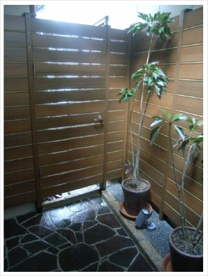 脱衣所の壁の向こう側は、雑然とした物置スペースでした。浴室を改装した際に、脱衣所の腰高窓は出入りができる掃出し窓に取り替えられました。