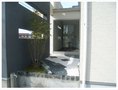 白と黒の外壁に、白木の壁。そんな和モダンな外観に合わせ、外構もモノトーンで統一。 |