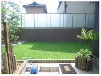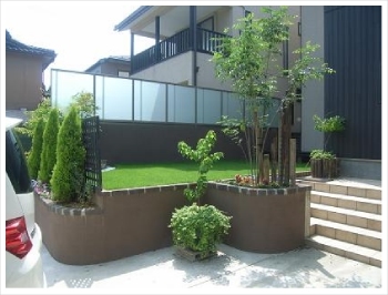 花壇と同じ化粧塗り壁の上に設置するフェンスは、三協立山アルミ「ニューカムフィ14型」をチョイス。パネルがポリカーボネートなので、光を取り入れ暗くならずにしっかりと視線をカットする事ができます。 |