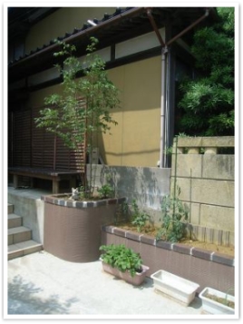 段違いに低めに作った長い花壇は、菜園スペースとして活躍しています。