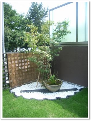 芝生の緑とのコントラストも美しい坪庭に仕上がりました。 |