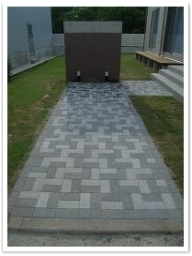 アプローチはインターロッキング敷きです。使用したのは、東洋工業「ハイブリック4」です。 ホワイトとグレーを規則的に配置したモノトーンの幾何学的な模様は、お客様が納得行くまで何パターンも出させて頂きました。 |