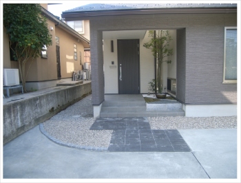 アプローチは濃いグレーの平板ブロックをクランクさせて敷き、奥行き感を出しました。