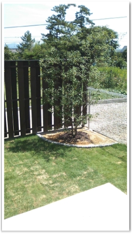 芝生の中央に作ったピンコロの花壇に植えたのは、風当たりの強い場所でも元気に育つ「アオダモ」の株立ちです。こちらのシンボルツリーのアオダモは、落葉樹なので秋には紅葉で色づいた葉を楽しむ事ができます。 |