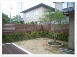 門袖の白色につる性植物の緑が映え、レンガの花壇に植えたシマトネリコの葉が、サラサラと風に揺れ爽やかな印象です。