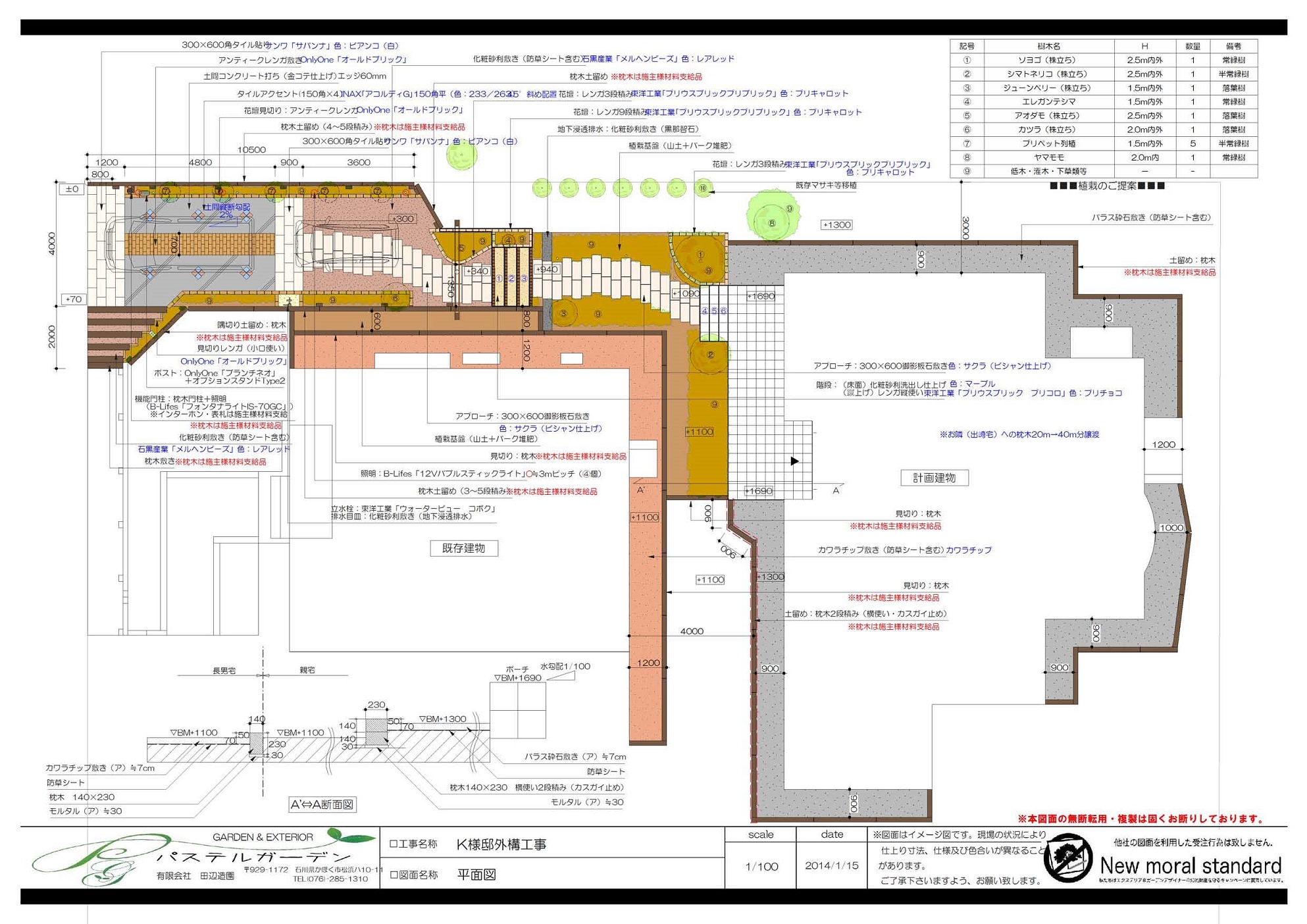 ただし、弊社では他社様の図面での御見積りはお断りしております。デザインをし図面化するというのは大変な時間と労力をかけた作業です。パステル・ガーデンは他社様の仕事を尊重し、すべて自社設計の方針で営業しておりますので、何卒ご了承下さい。 |